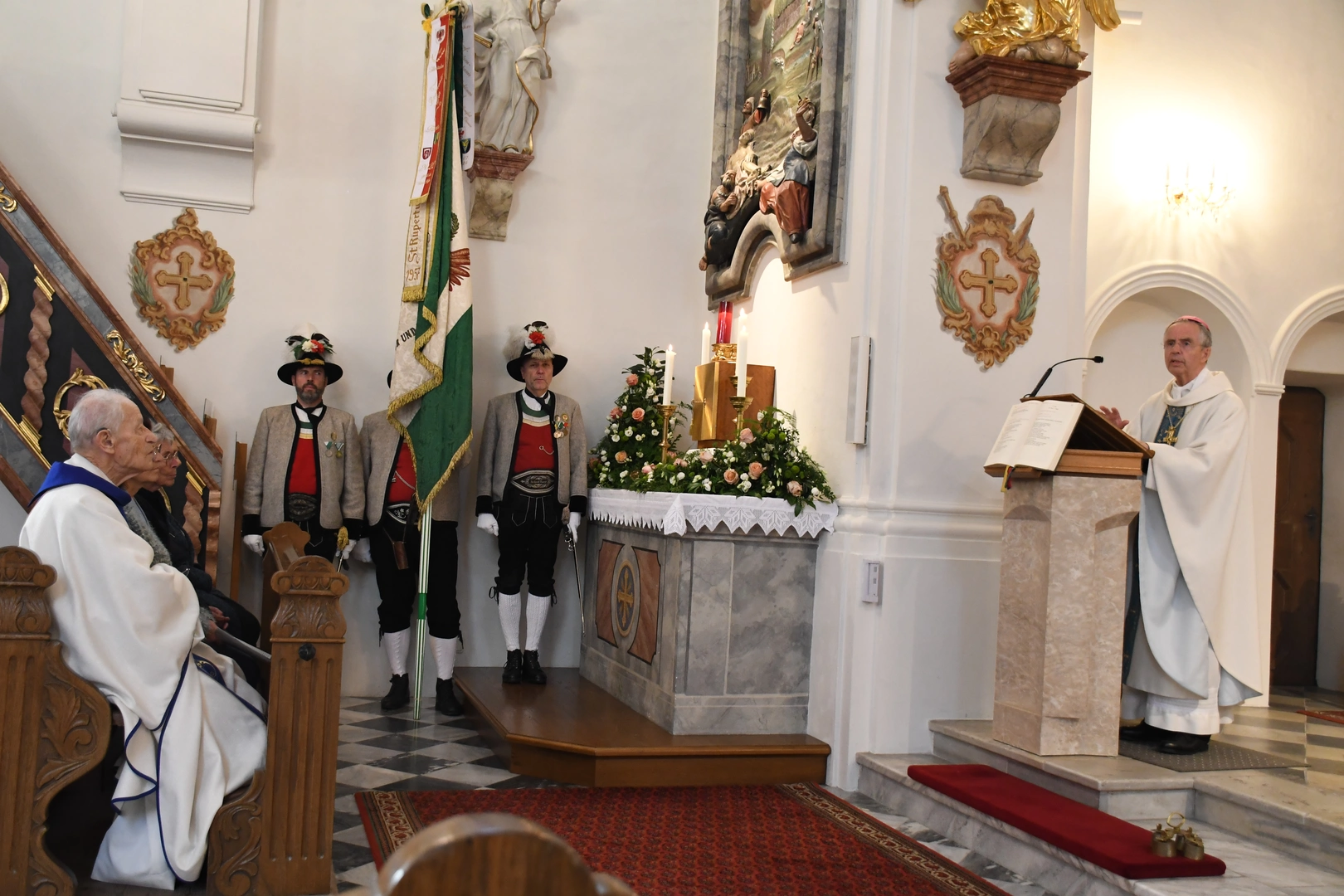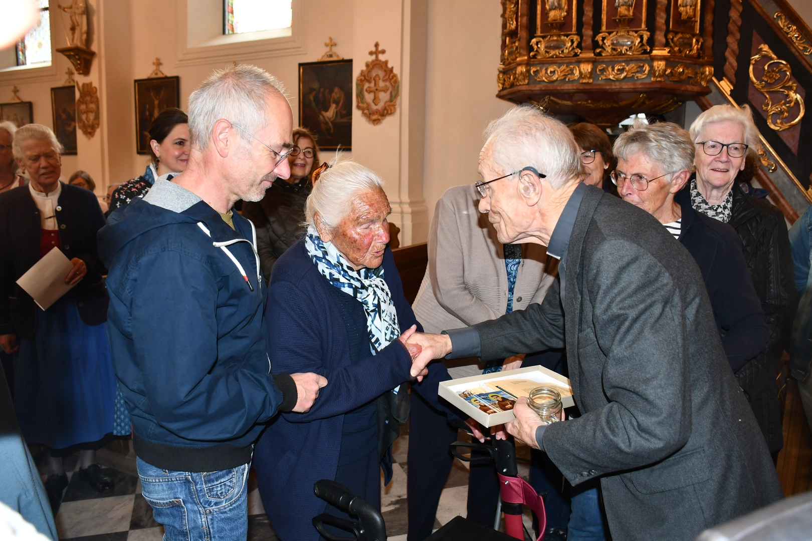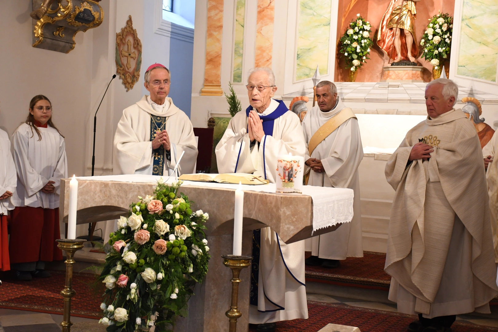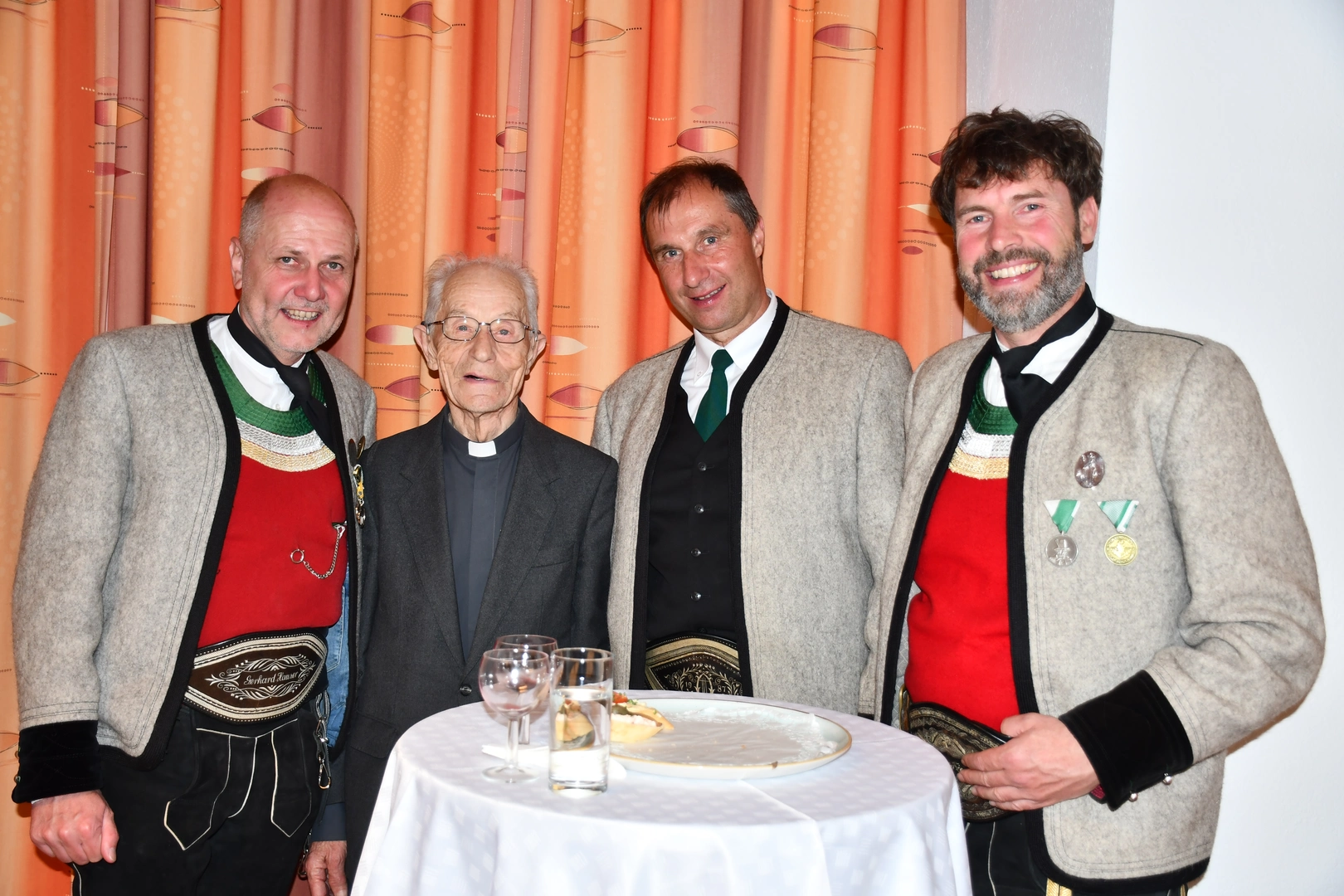Am Abend fand der feierliche Einzug in die Pfarrkirche mit dem Jubilar, unserem Weihbischof Hansjörg und den Priesterkollegen, vielen Ministranten sowie der Schützen- und Feuerwehrabordnung in die Pfarrkirche statt. Der Kirchenchor und die Bläsergruppe der BMK gestalteten die Hl. Messe hervorragend. Weihbischof Hansjörg hielt eine beindruckende Predigt über Pfarrer Hansl Ebster: Vor allem bedankte er sich bei Hansl für die vielen Jahre der Seelsorge in der Erzdiözese Salzburg, deren ältester Priester er zurzeit ist. Er brennt als Priester für Christus durch und durch! Er schaut auf Christus mit Herz und Verstand, er vertraut und hört auf ihn, er denkt an Gott und geht mit ihm… WB Hansjörg erzählte auch, dass er zum Stadtbild von Salzburg gehört, da er immer noch mit dem Fahrrad dort unterwegs ist. Zum Abschluss die herzlichsten Glückwünsche zu diesem hohen runden Geburtstag und Gottes reichen Segen im Namen der gesamten Pfarrgemeinde! Nach dem Gottesdienst konnten alle KirchenbesucherInnen noch persönlich gratulieren. Der Kirchenchor sang ihm noch ein Ständchen und vor dem Widum spielten die Bläser einige Stücke. Das freute Hansl besonders! Carla Mojto hatte am selben Tag Geburtstag, so gab es auch für sie viele Glückwünsche von allen. Mit einer feinen Agape im Pfarrhof klang dieser Festabend gesellig aus.