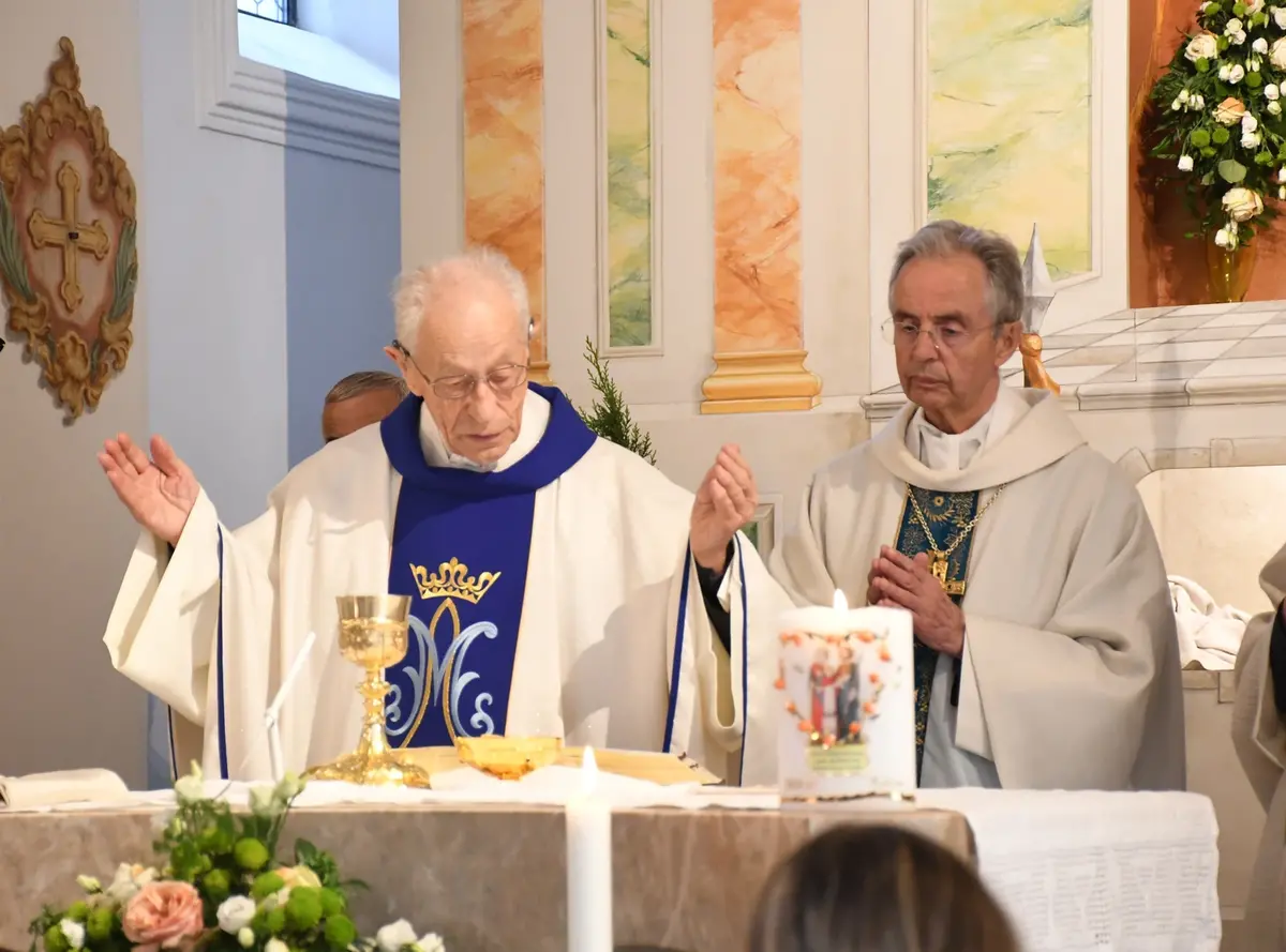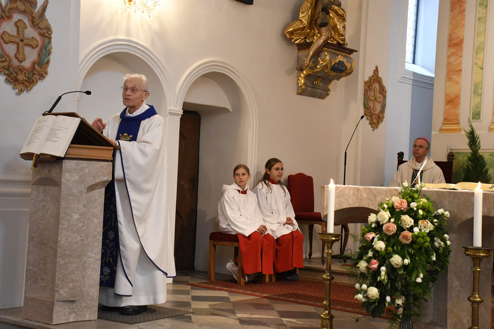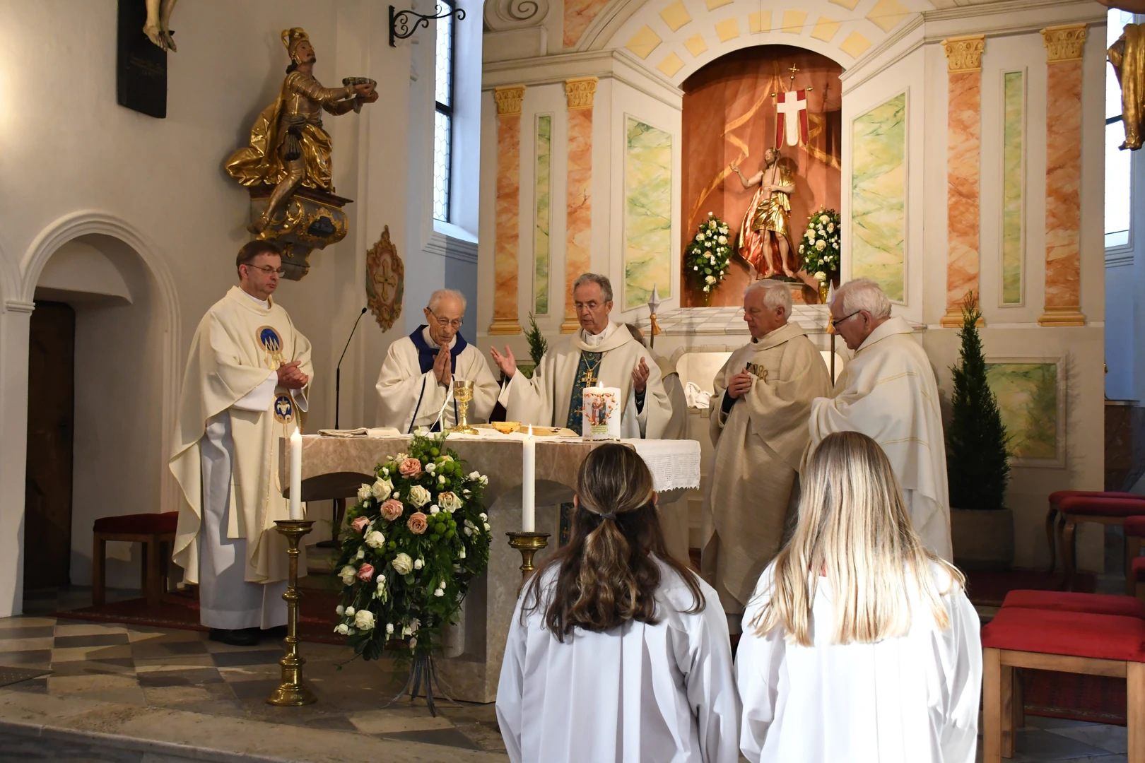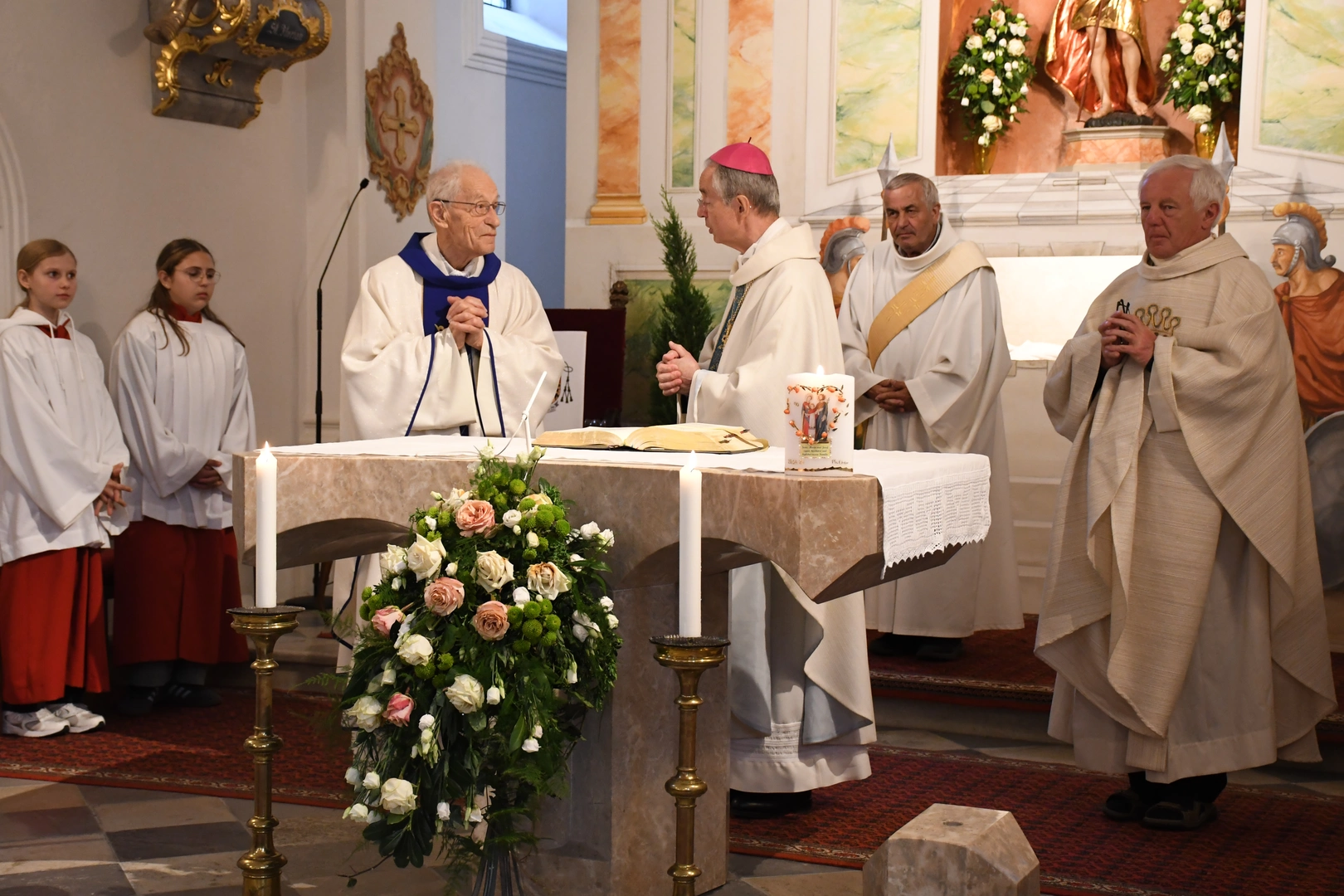 Am Abend fand der feierliche Einzug in die Pfarrkirche mit dem Jubilar, unserem Weihbischof Hansjörg und den Priesterkollegen, vielen Ministranten sowie der Schützen- und Feuerwehrabordnung in die Pfarrkirche statt. Der Kirchenchor und die Bläsergruppe der BMK gestalteten die Hl. Messe hervorragend. Weihbischof Hansjörg hielt eine beindruckende Predigt über Pfarrer Hansl Ebster: Vor allem bedankte er sich bei Hansl für die vielen Jahre der Seelsorge in der Erzdiözese Salzburg, deren ältester Priester er zurzeit ist. Er brennt als Priester für Christus durch und durch! Er schaut auf Christus mit Herz und Verstand, er vertraut und hört auf ihn, er denkt an Gott und geht mit ihm… WB Hansjörg erzählte auch, dass er zum Stadtbild von Salzburg gehört, da er immer noch mit dem Fahrrad dort unterwegs ist. Zum Abschluss die herzlichsten Glückwünsche zu diesem hohen runden Geburtstag und Gottes reichen Segen im Namen der gesamten Pfarrgemeinde! Nach dem Gottesdienst konnten alle KirchenbesucherInnen noch persönlich gratulieren. Der Kirchenchor sang ihm noch ein Ständchen und vor dem Widum spielten die Bläser einige Stücke. Das freute Hansl besonders! Carla Mojto hatte am selben Tag Geburtstag, so gab es auch für sie viele Glückwünsche von allen. Mit einer feinen Agape im Pfarrhof klang dieser Festabend gesellig aus.