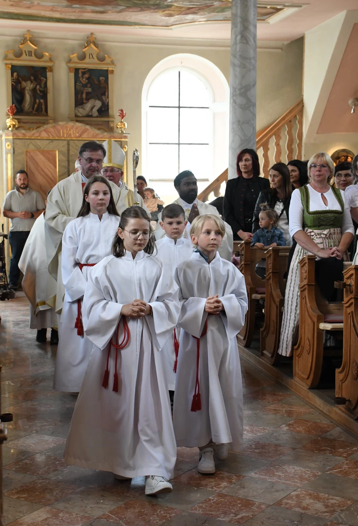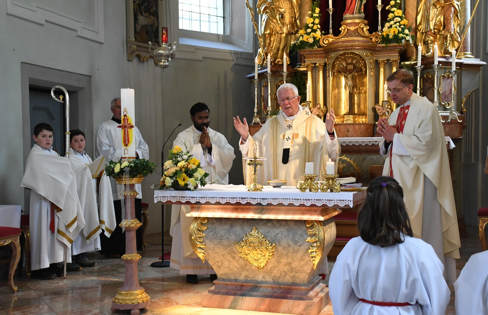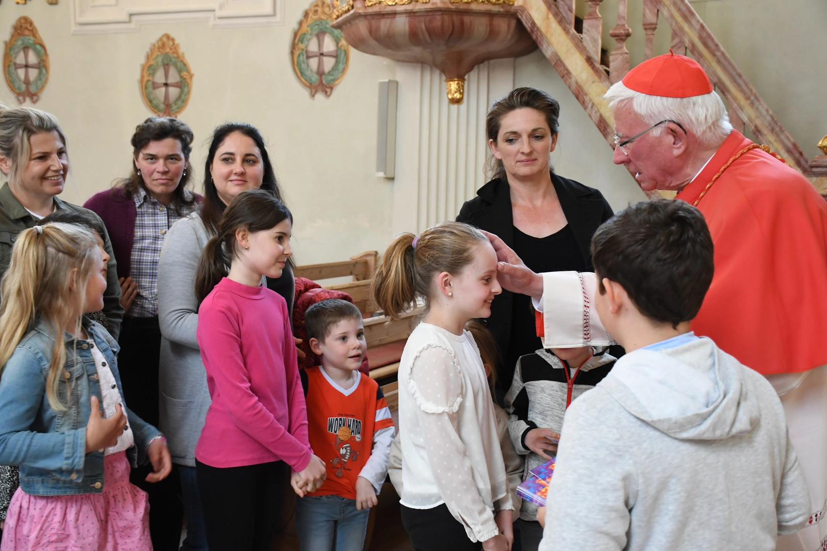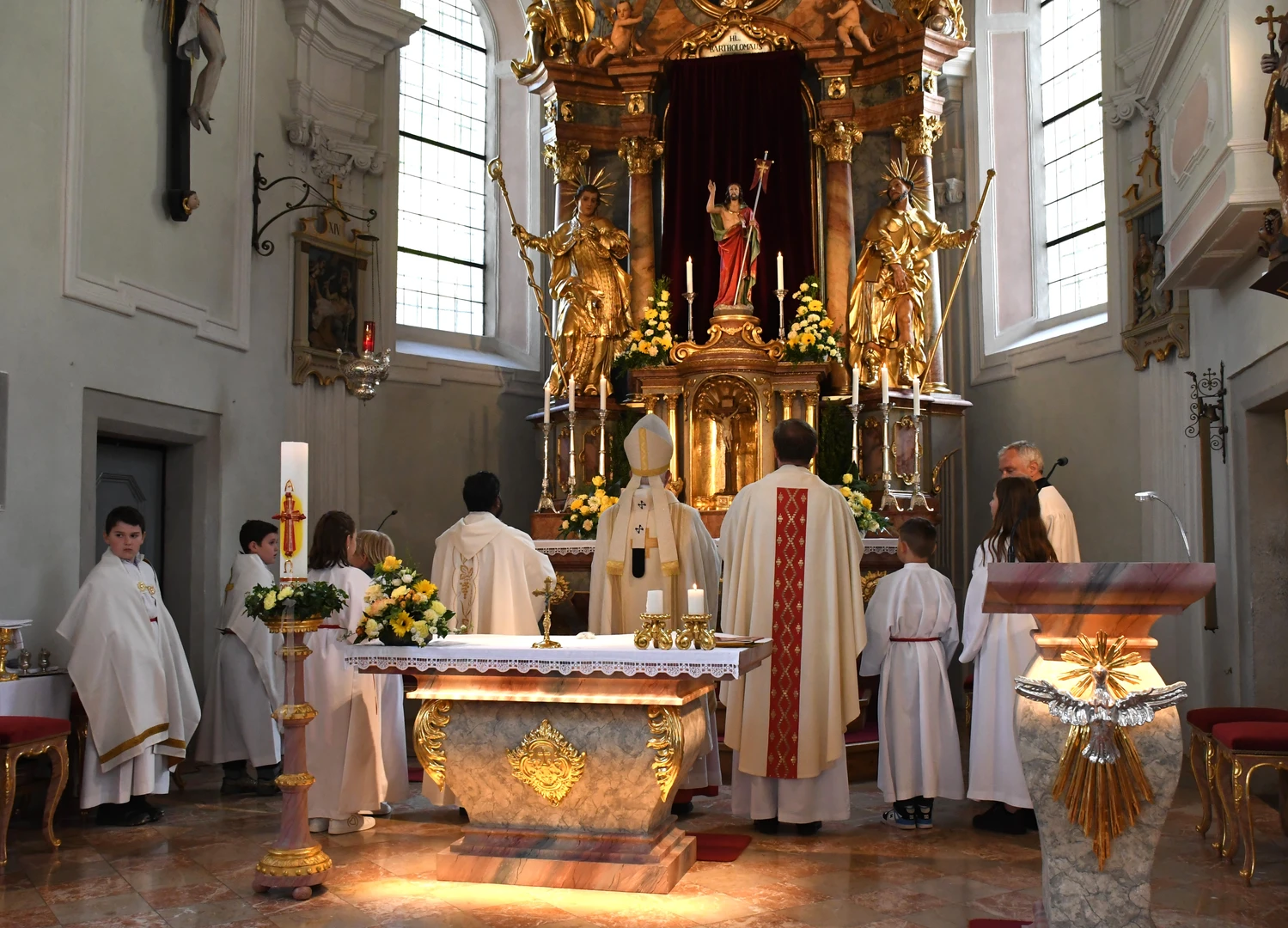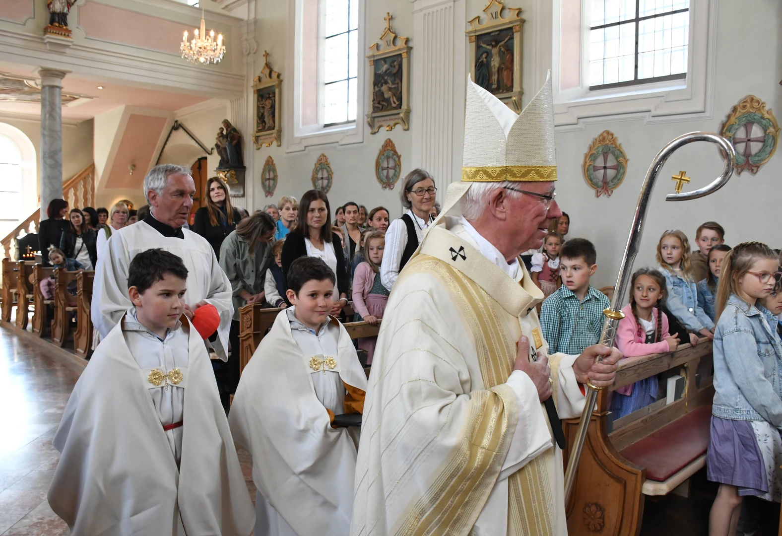 Vor dem Widum wurde er von der Pfarre mit PGR, PKR und dem Bürgermeister mit den Gemeinderäten herzlich willkommen geheißen. Nach dem gemeinsamen Einzug in die Pfarrkirche zelebrierte Bischof Lackner mit Pfarrer Proßegger und Kooperator James eine schöne Familienmesse. Der Kinderchor der Volksschule unter der Leitung von Christian Bockstaller gestaltete die Hl. Messe hervorragend und an der Orgel spielte Dr. Peter Rohe. In der Predigt ging der Bischof mit diversen Fragen über das Tagesevangelium vom „Guten Hirten“ auf die Kinder zu. Diese machten begeisternd mit, da er ein sehr freundlicher und offener Priester ist. Nach dem Gottesdienst segnete Bischof Lackner alle Kinder einzeln. Der freudige Tag ging mit einer vorzüglichen Jause und angeregten Gesprächen im Gemeindesaal zu Ende. Herzlichen Dank an alle, die für eine perfekte Feier gesorgt hatten.