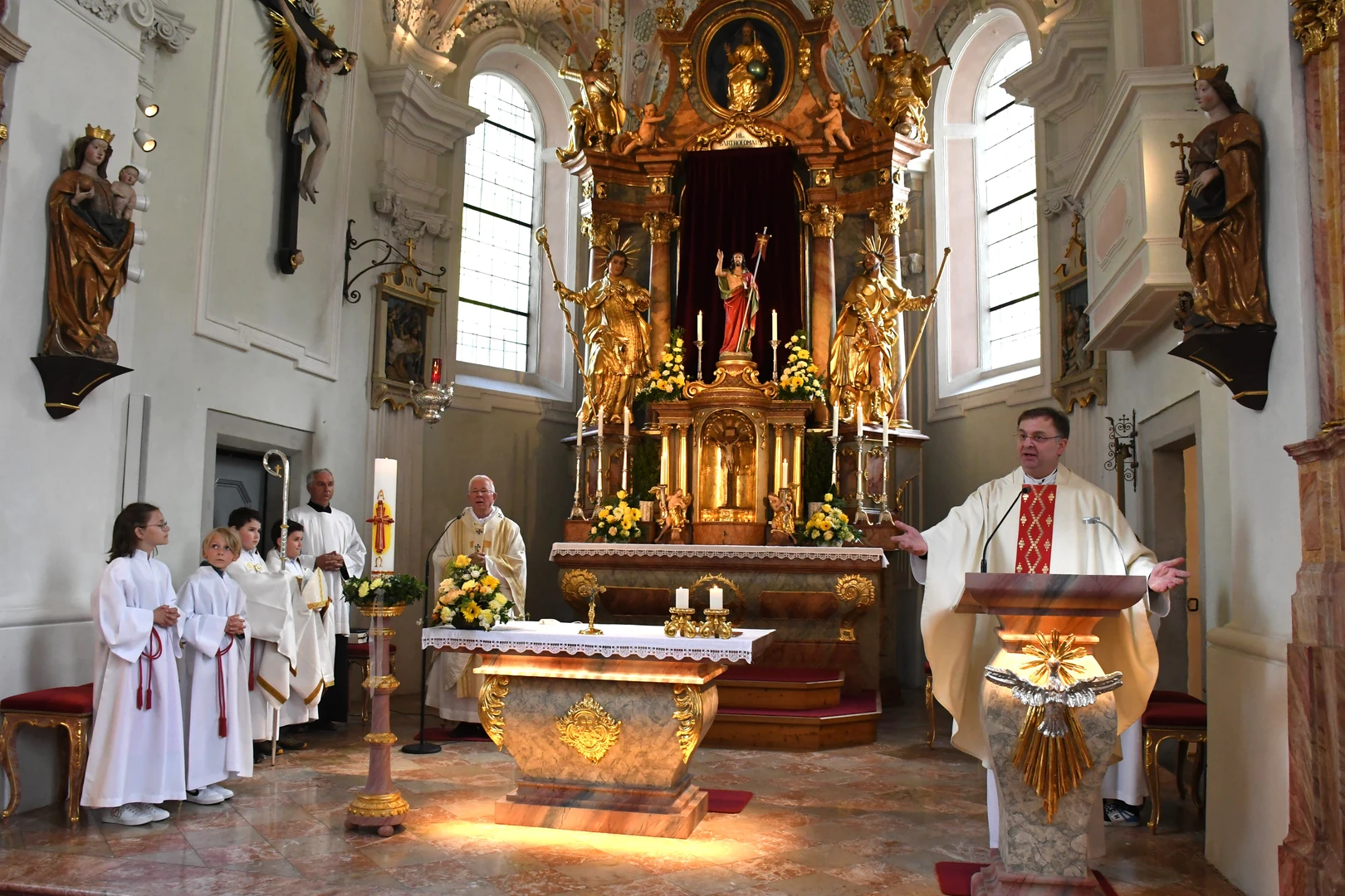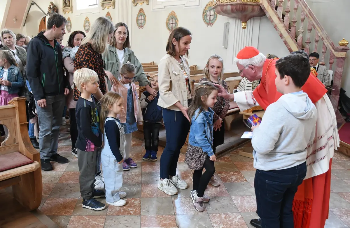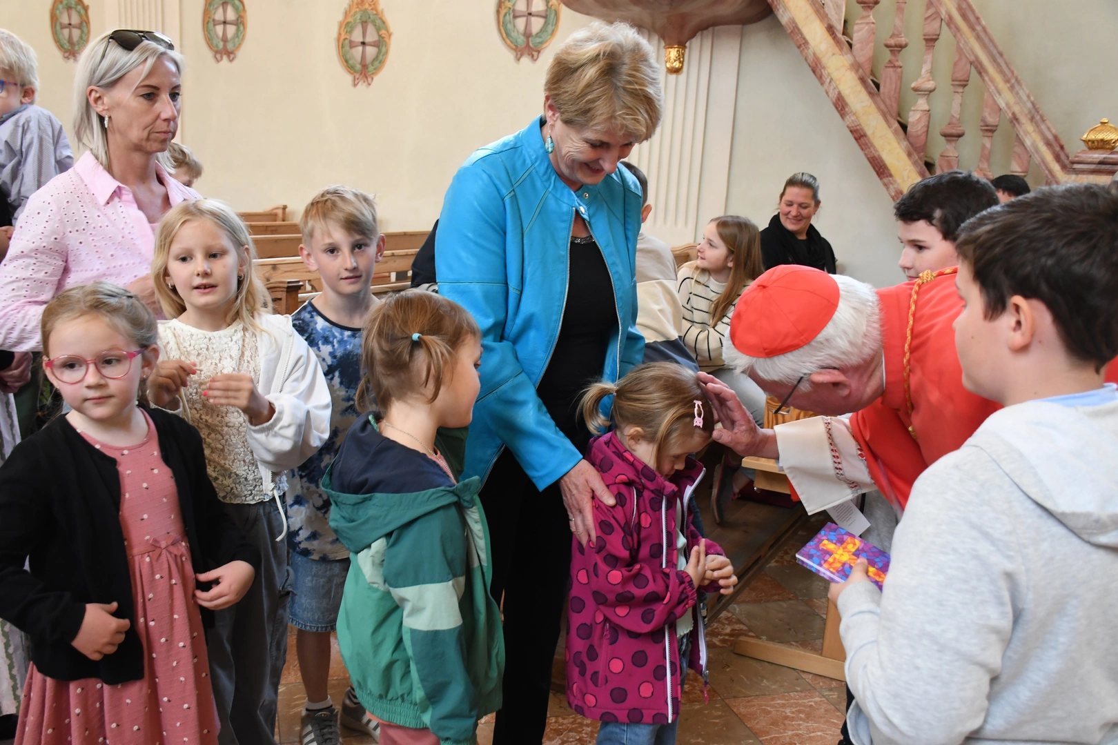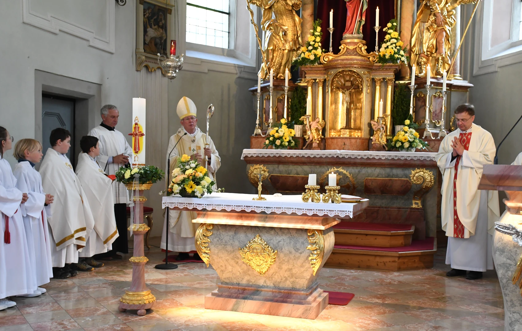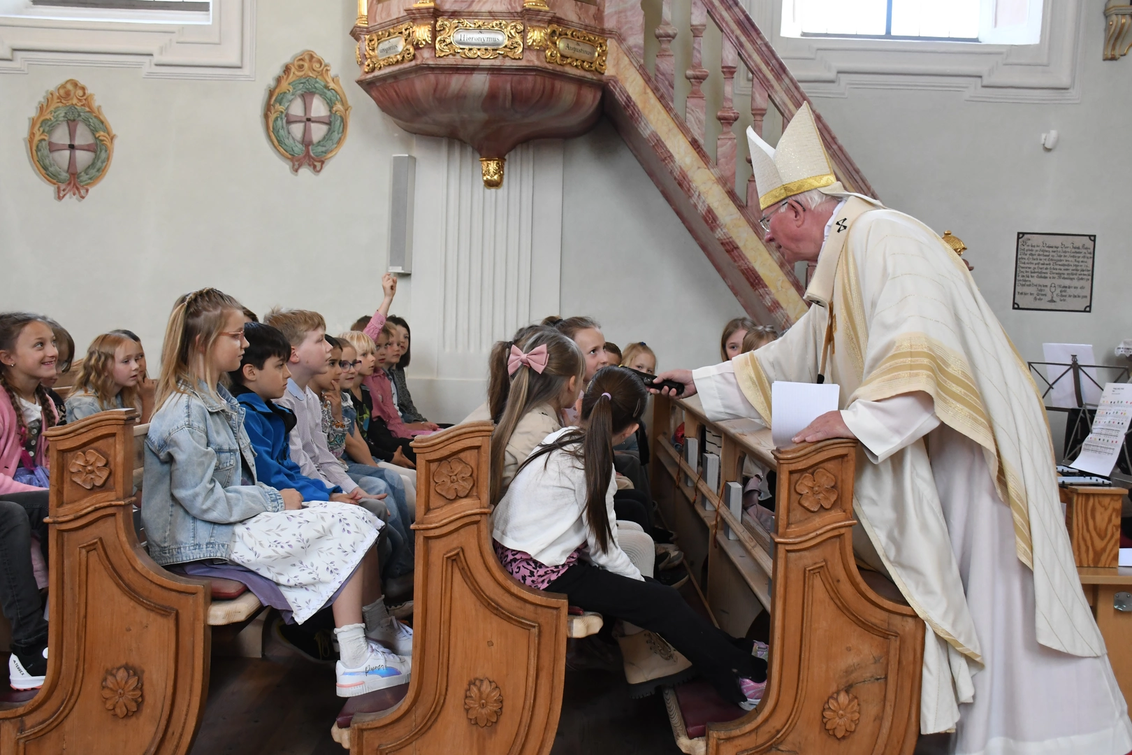 Vor dem Widum wurde er von der Pfarre mit PGR, PKR und dem Bürgermeister mit den Gemeinderäten herzlich willkommen geheißen. Nach dem gemeinsamen Einzug in die Pfarrkirche zelebrierte Bischof Lackner mit Pfarrer Proßegger und Kooperator James eine schöne Familienmesse. Der Kinderchor der Volksschule unter der Leitung von Christian Bockstaller gestaltete die Hl. Messe hervorragend und an der Orgel spielte Dr. Peter Rohe. In der Predigt ging der Bischof mit diversen Fragen über das Tagesevangelium vom „Guten Hirten“ auf die Kinder zu. Diese machten begeisternd mit, da er ein sehr freundlicher und offener Priester ist. Nach dem Gottesdienst segnete Bischof Lackner alle Kinder einzeln. Der freudige Tag ging mit einer vorzüglichen Jause und angeregten Gesprächen im Gemeindesaal zu Ende. Herzlichen Dank an alle, die für eine perfekte Feier gesorgt hatten.