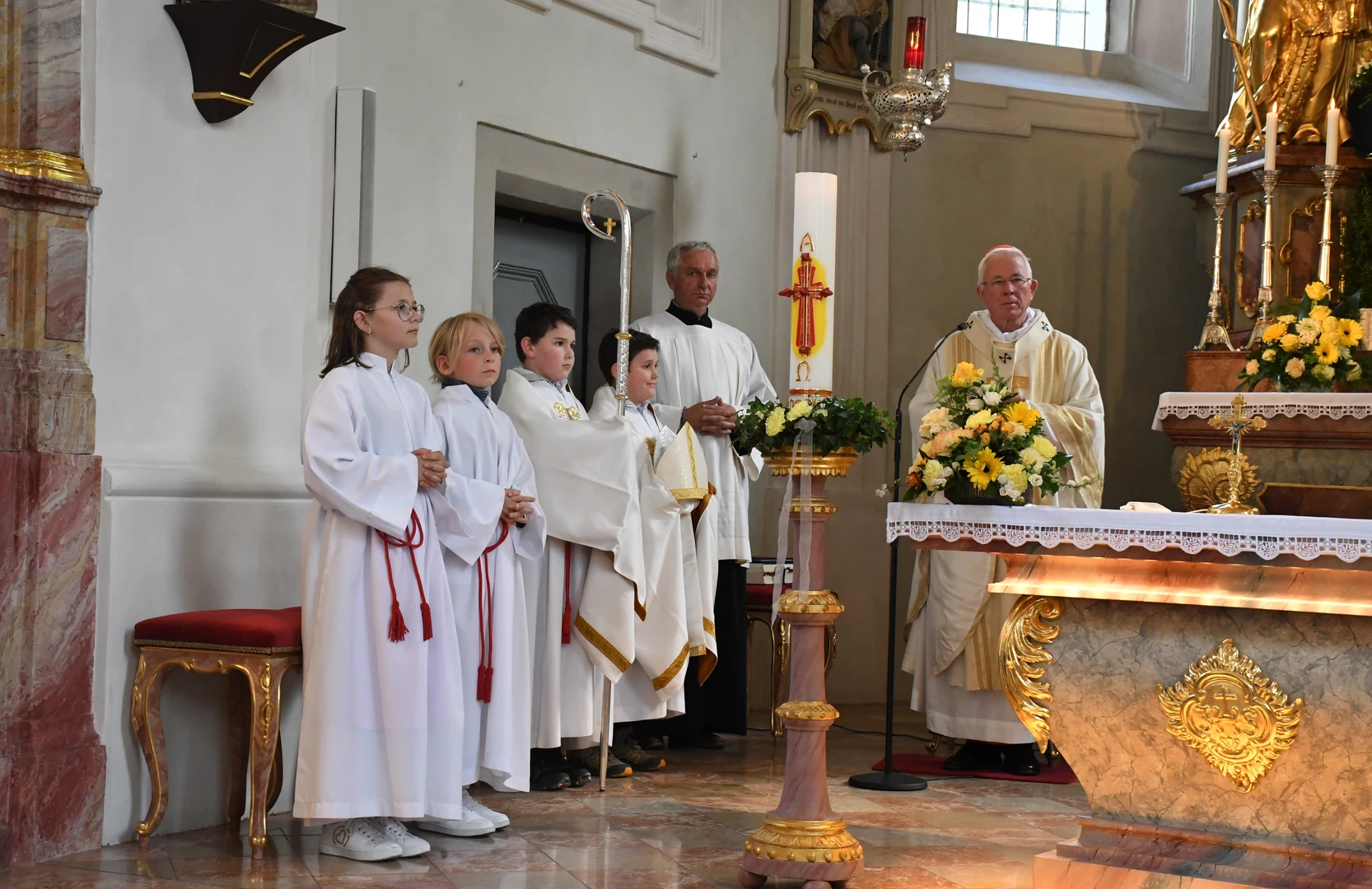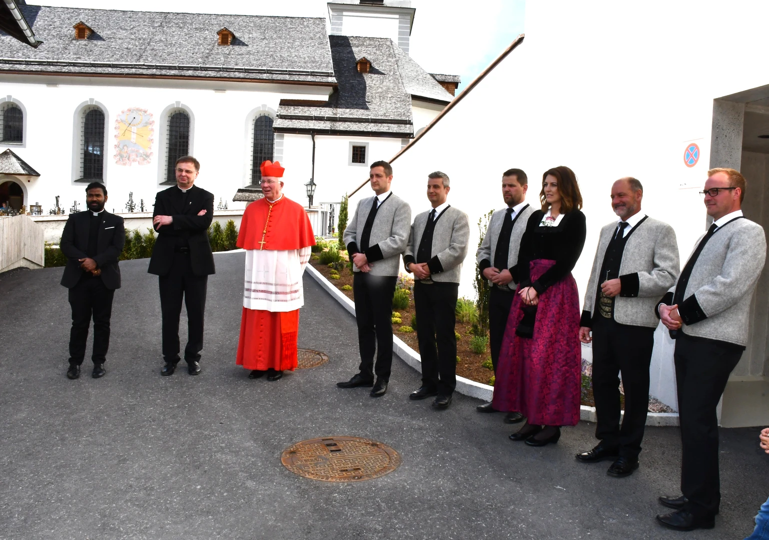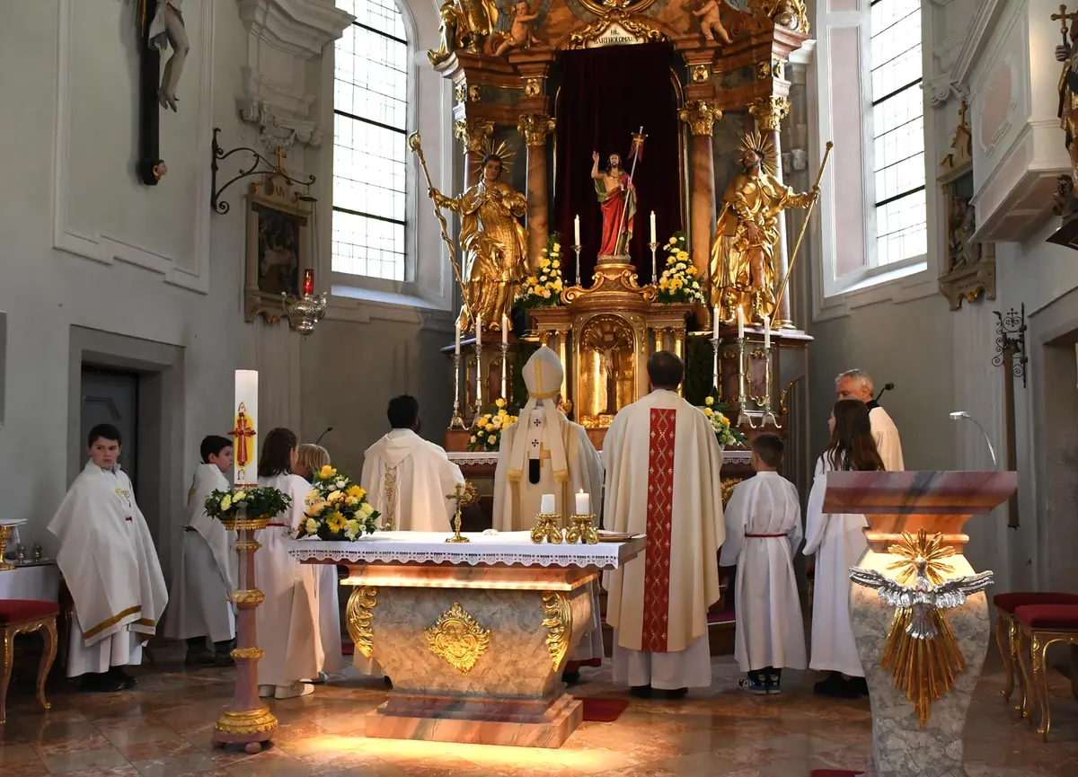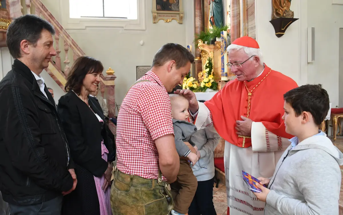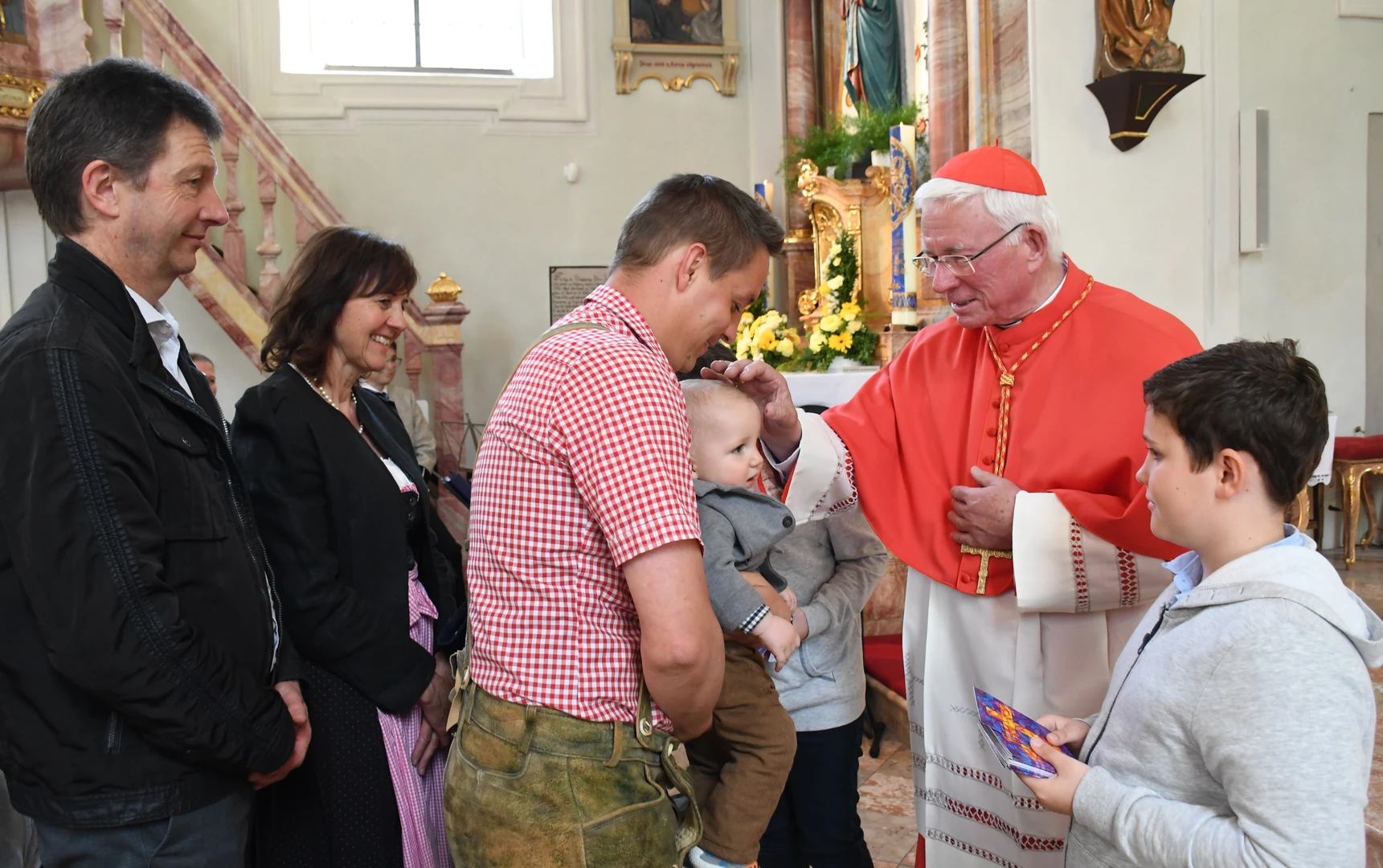 Vor dem Widum wurde er von der Pfarre mit PGR, PKR und dem Bürgermeister mit den Gemeinderäten herzlich willkommen geheißen. Nach dem gemeinsamen Einzug in die Pfarrkirche zelebrierte Bischof Lackner mit Pfarrer Proßegger und Kooperator James eine schöne Familienmesse. Der Kinderchor der Volksschule unter der Leitung von Christian Bockstaller gestaltete die Hl. Messe hervorragend und an der Orgel spielte Dr. Peter Rohe. In der Predigt ging der Bischof mit diversen Fragen über das Tagesevangelium vom „Guten Hirten“ auf die Kinder zu. Diese machten begeisternd mit, da er ein sehr freundlicher und offener Priester ist. Nach dem Gottesdienst segnete Bischof Lackner alle Kinder einzeln. Der freudige Tag ging mit einer vorzüglichen Jause und angeregten Gesprächen im Gemeindesaal zu Ende. Herzlichen Dank an alle, die für eine perfekte Feier gesorgt hatten.