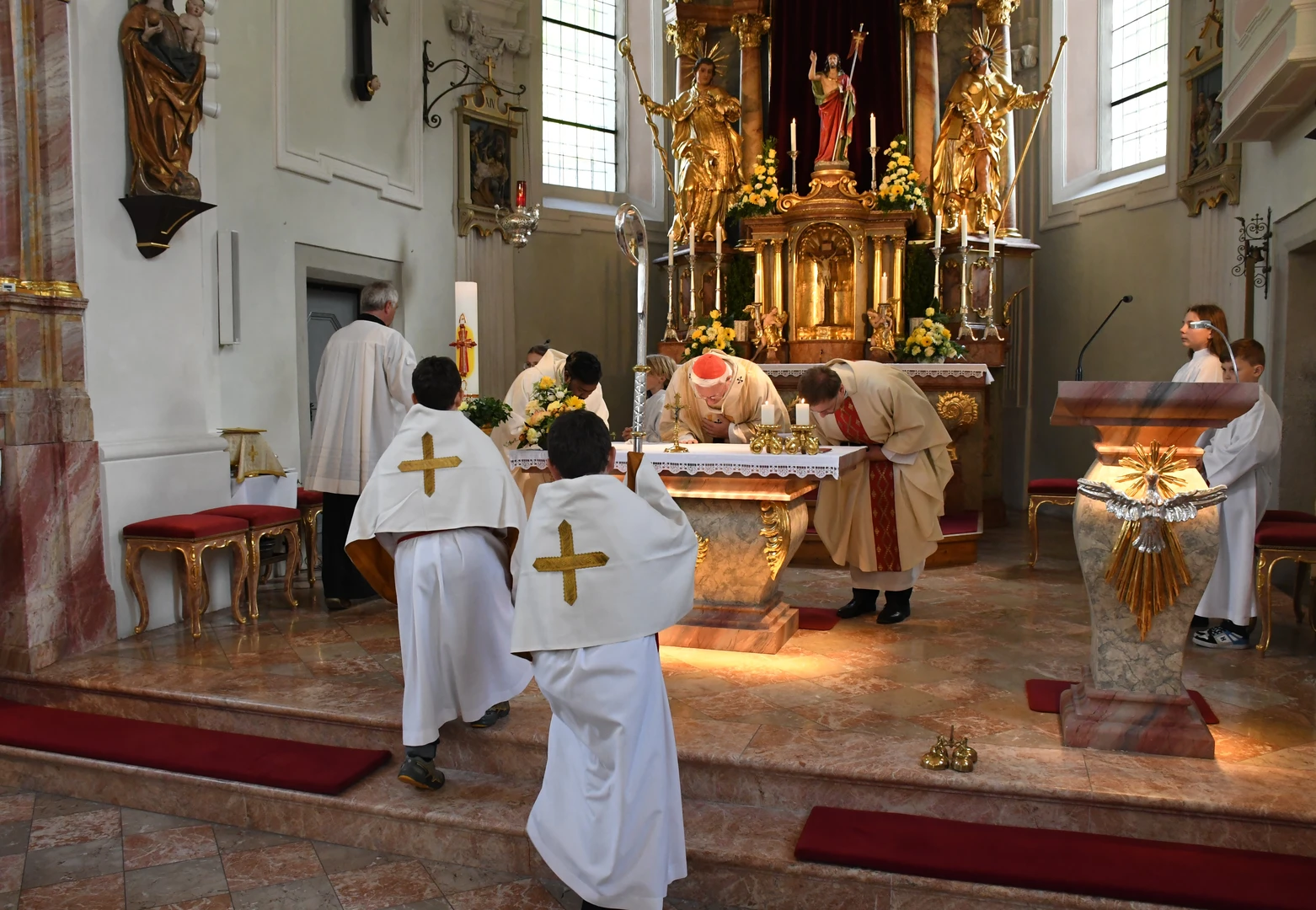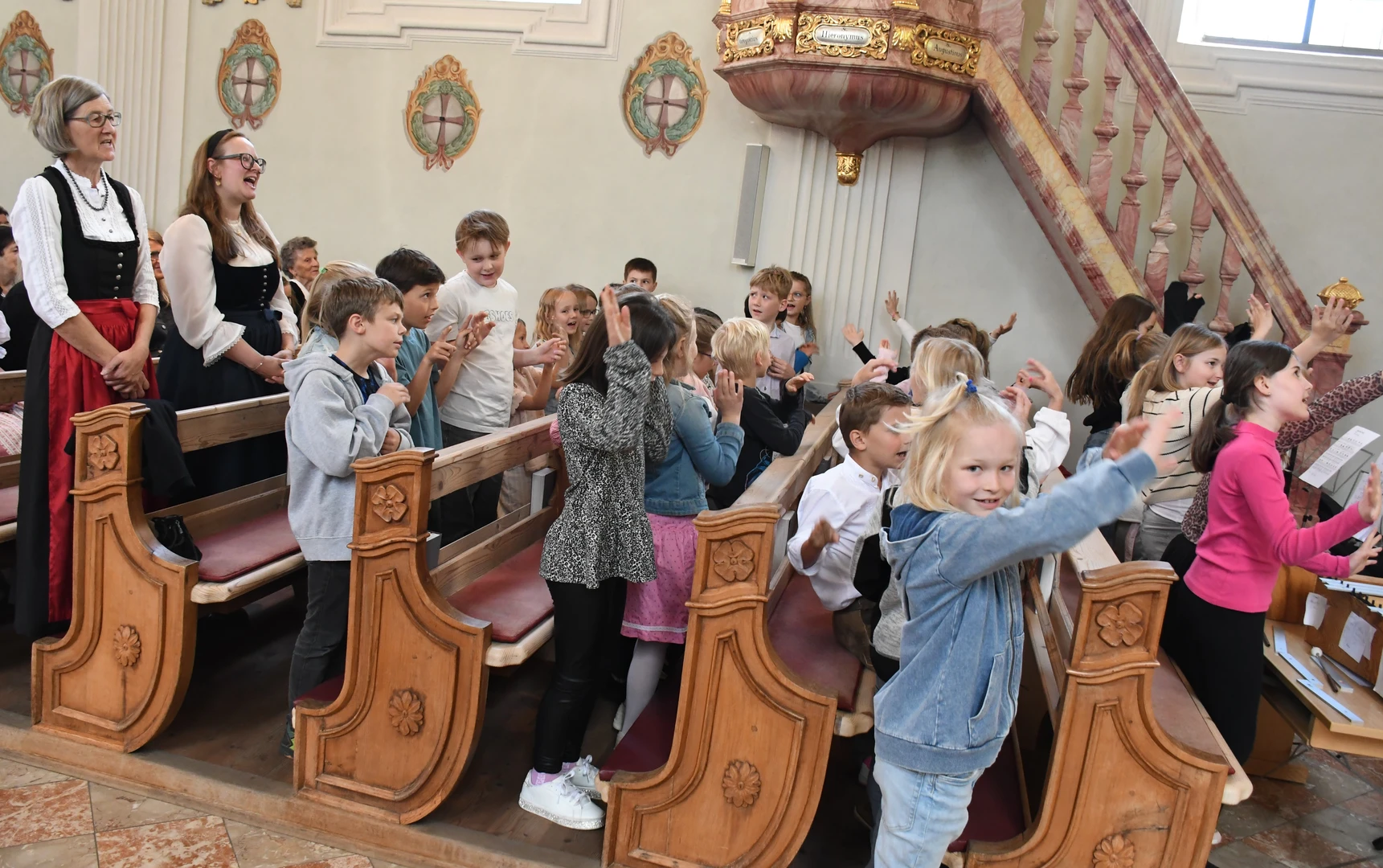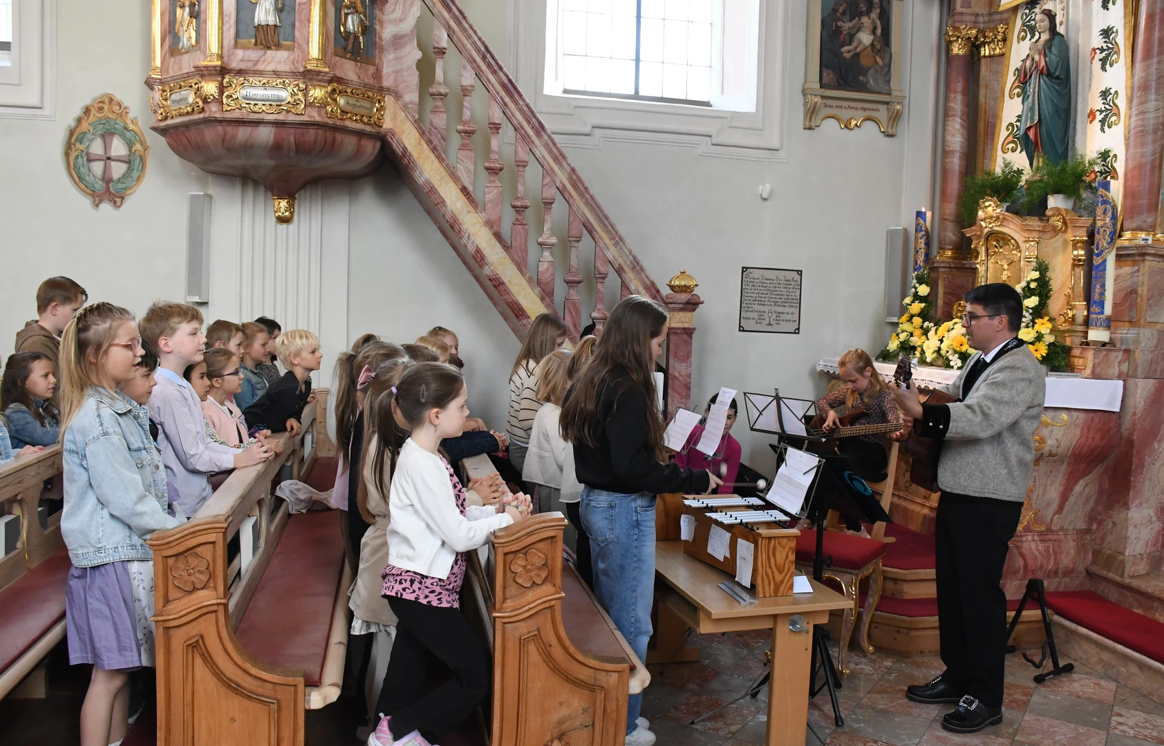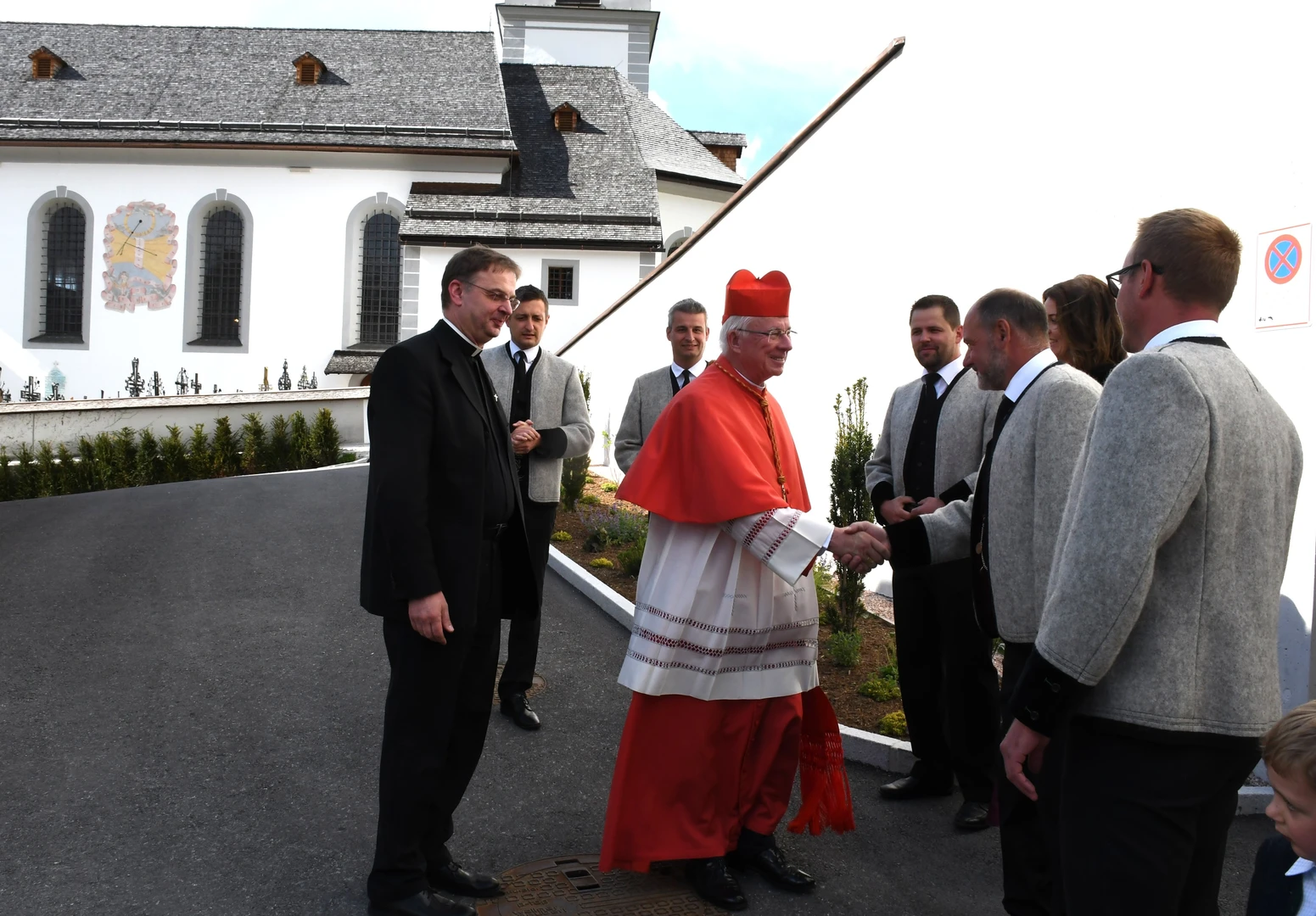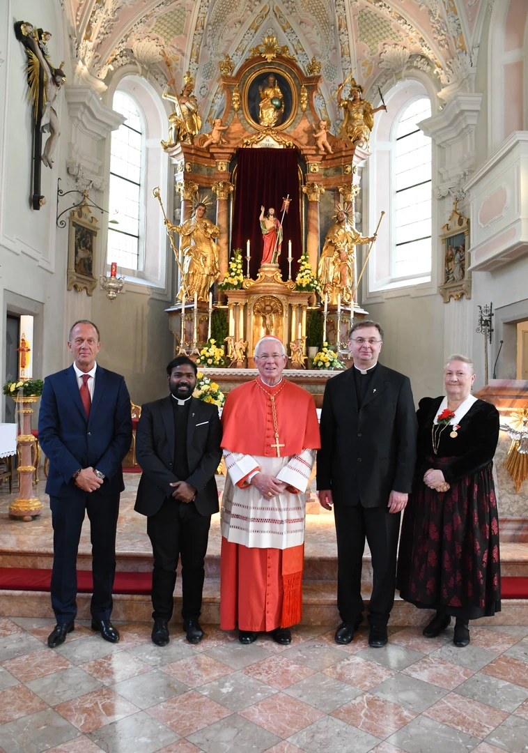 Vor dem Widum wurde er von der Pfarre mit PGR, PKR und dem Bürgermeister mit den Gemeinderäten herzlich willkommen geheißen. Nach dem gemeinsamen Einzug in die Pfarrkirche zelebrierte Bischof Lackner mit Pfarrer Proßegger und Kooperator James eine schöne Familienmesse. Der Kinderchor der Volksschule unter der Leitung von Christian Bockstaller gestaltete die Hl. Messe hervorragend und an der Orgel spielte Dr. Peter Rohe. In der Predigt ging der Bischof mit diversen Fragen über das Tagesevangelium vom „Guten Hirten“ auf die Kinder zu. Diese machten begeisternd mit, da er ein sehr freundlicher und offener Priester ist. Nach dem Gottesdienst segnete Bischof Lackner alle Kinder einzeln. Der freudige Tag ging mit einer vorzüglichen Jause und angeregten Gesprächen im Gemeindesaal zu Ende. Herzlichen Dank an alle, die für eine perfekte Feier gesorgt hatten.