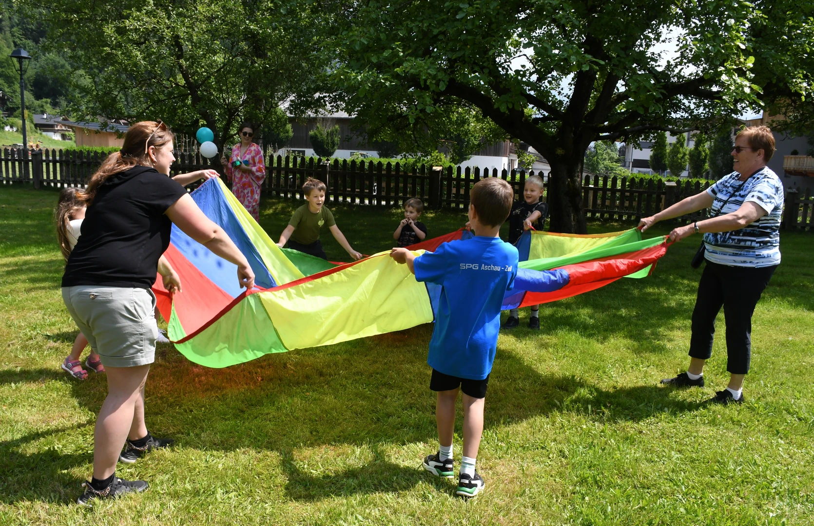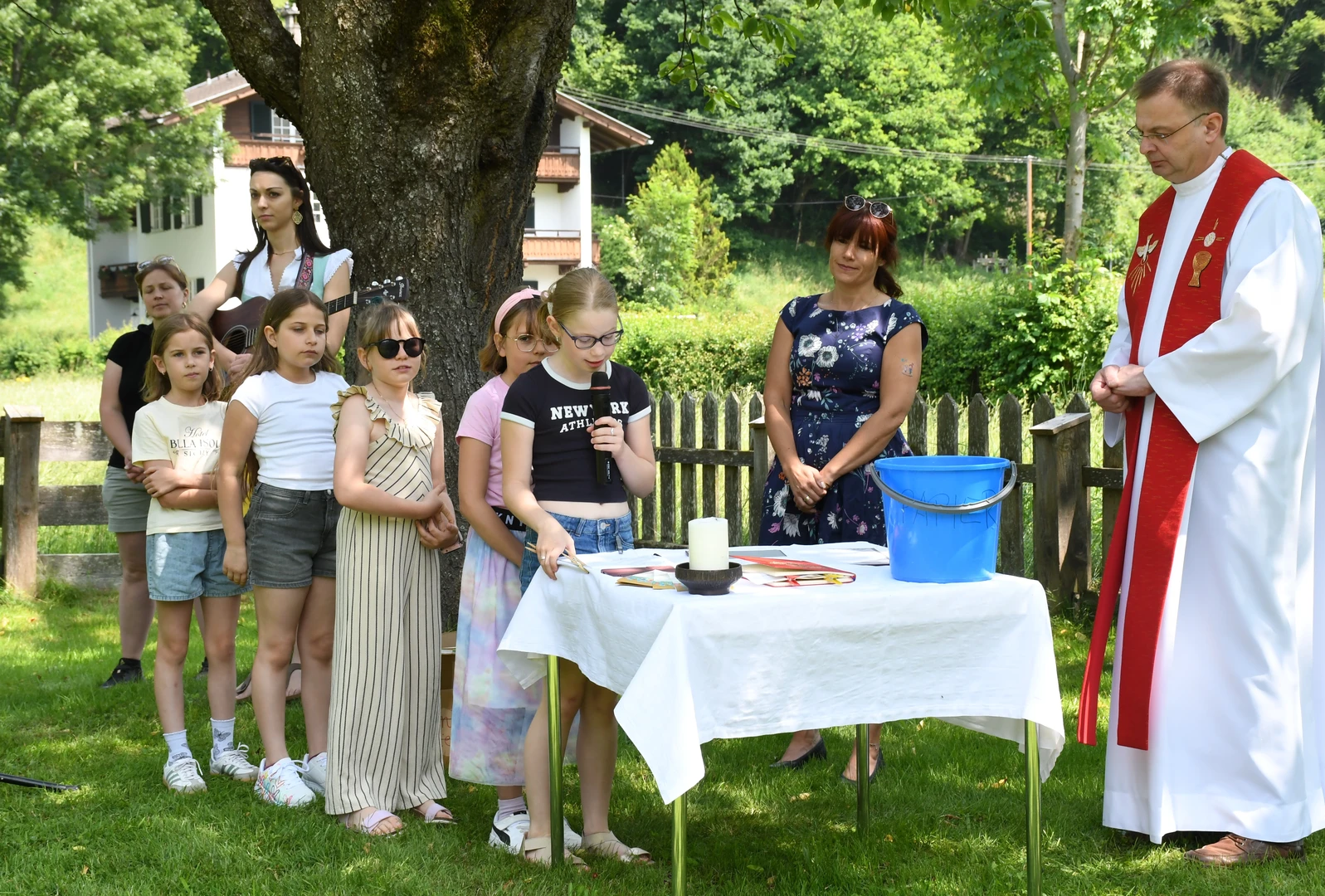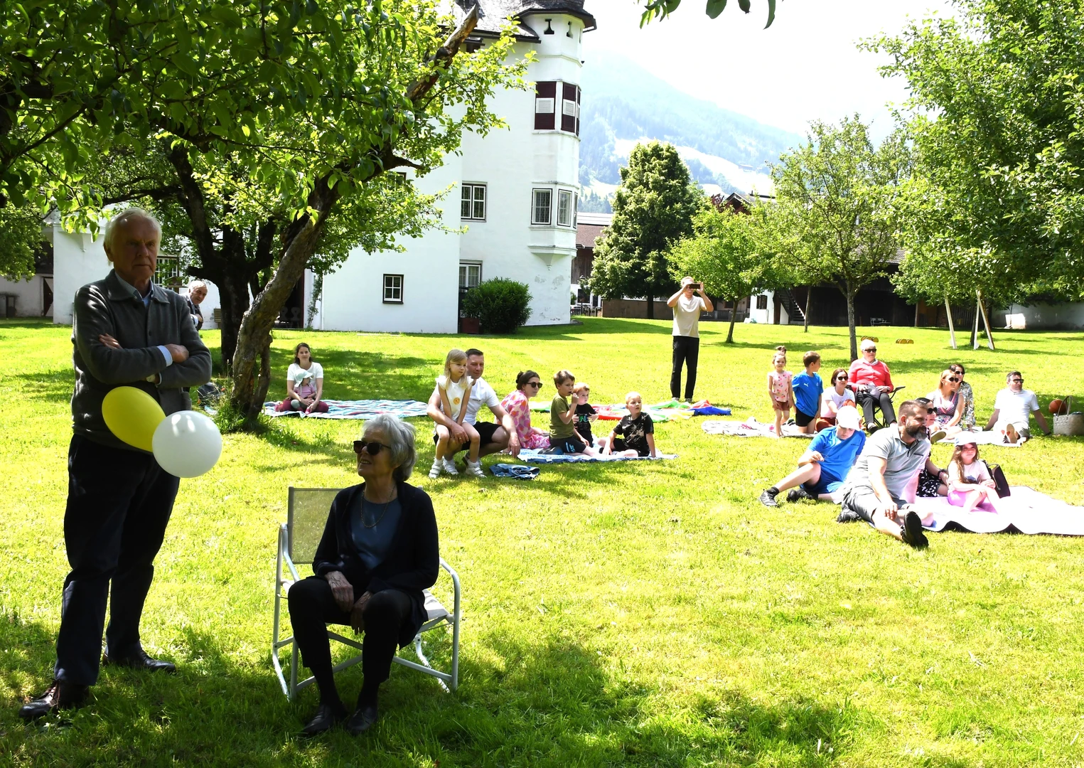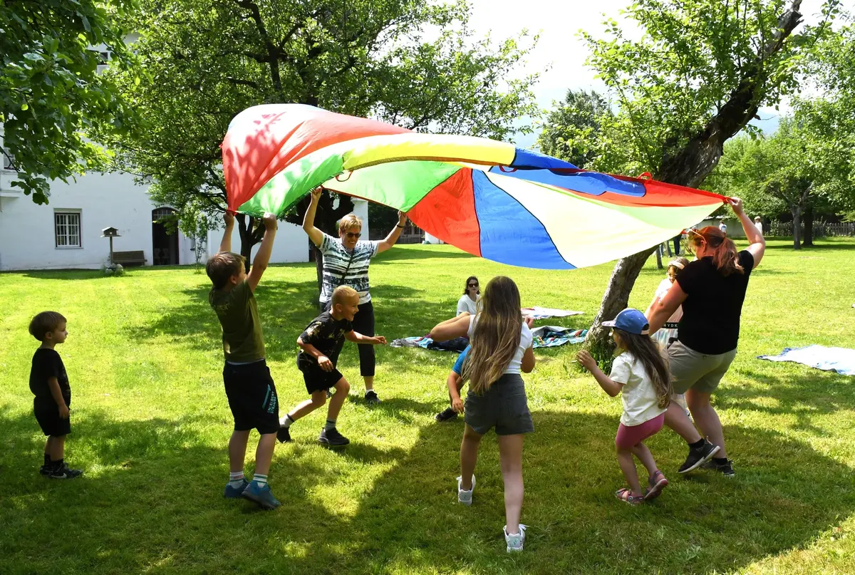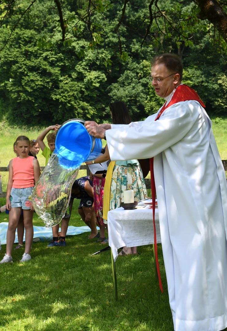 Pfarrer Proßegger hatte diese wunderbare Idee, ein Familienfest im Schlossgarten abzuhalten. Dankenswerterweise erhielten wir die Zusage von Fam. Mojto, die dazu ihren schönen Garten zur Verfügung stellte. Viele Familien waren gekommen und breiteten sich auf der großen Wiese mit ihren Decken gemütlich aus. Die Jungschargruppe gestaltete die Andacht am Beginn mit Texten und großartigen Liedern hervorragend. Pfarrer Proßegger verwies in einer kurzen Ansprache auf die Geistkraft Gottes zu Pfingsten. Man soll Negatives ausleeren wie einen Kübel Wasser und sich öfters Zeit nehmen für die „Stille“. Nachdem er alle BesucherInnen gesegnet hatte, wurde der Nachmittag freigegeben für Spiel und Spaß!  Es war eine riesige Freude zu sehen, wie Klein und Groß sich bei den verschiedenen Spielen amüsierten. Herzlichen Dank an alle Beteiligten und hoffentlich auf eine Wiederholung im nächsten Jahr!