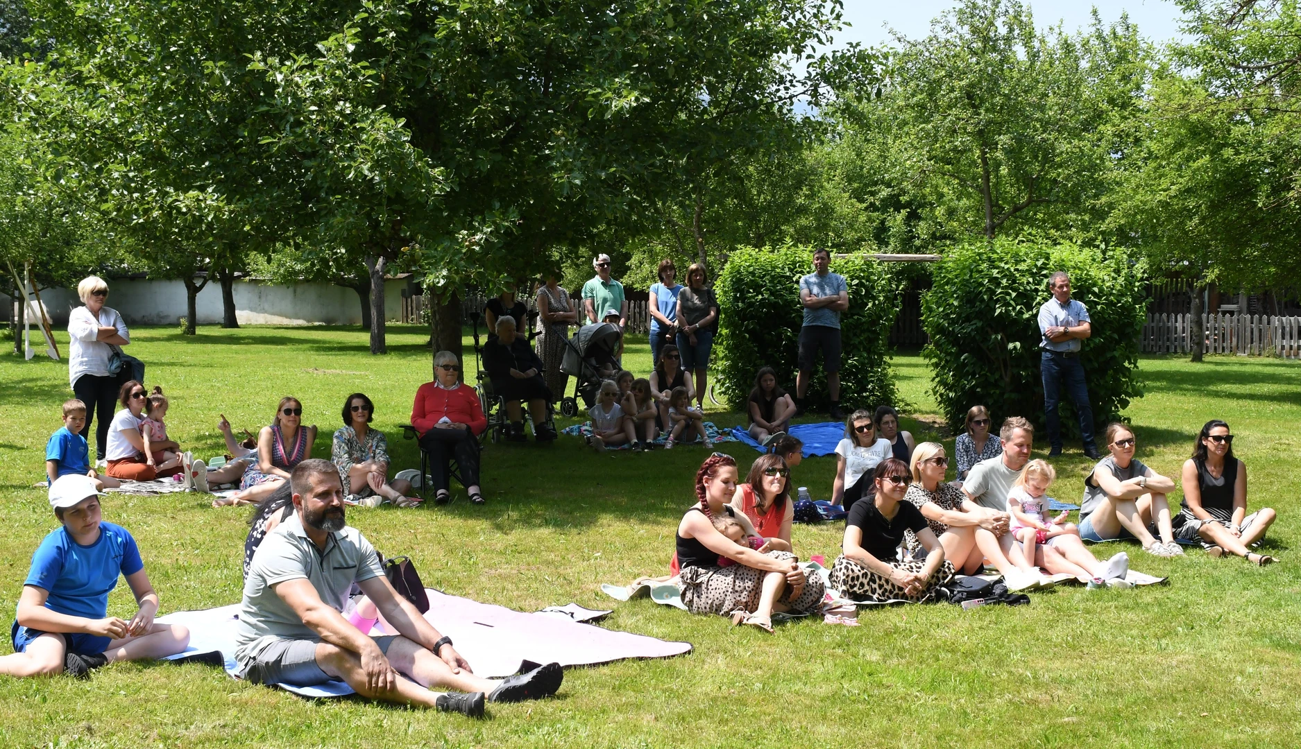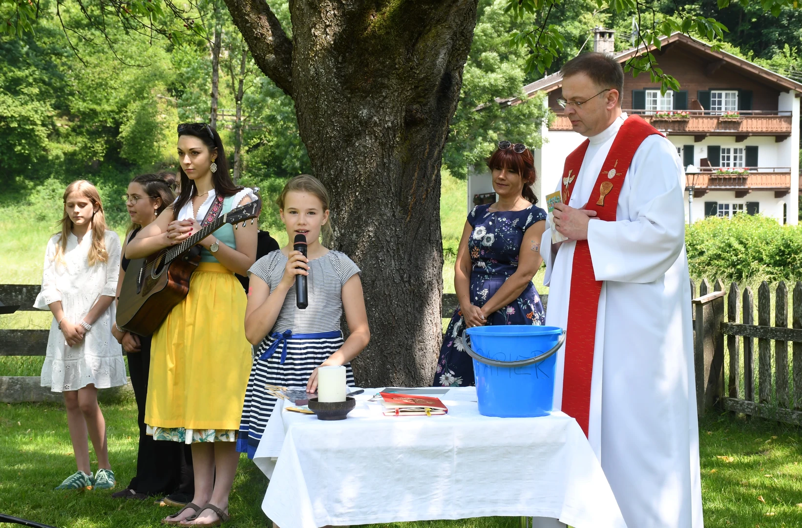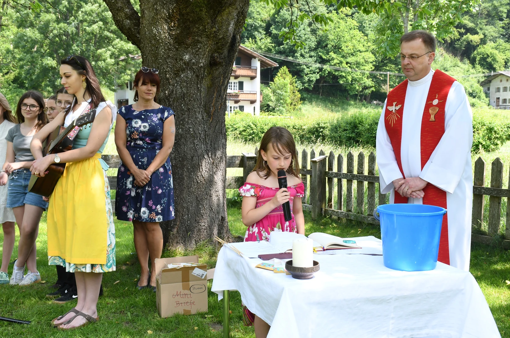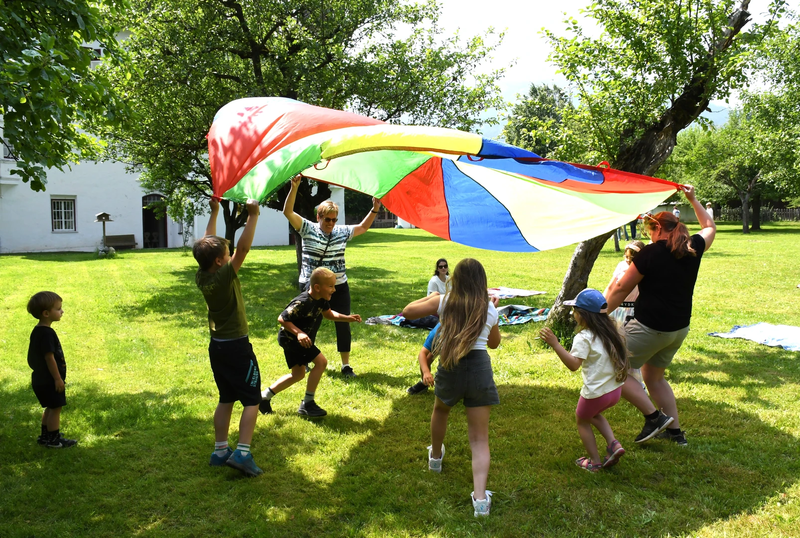 Pfarrer Proßegger hatte diese wunderbare Idee, ein Familienfest im Schlossgarten abzuhalten. Dankenswerterweise erhielten wir die Zusage von Fam. Mojto, die dazu ihren schönen Garten zur Verfügung stellte. Viele Familien waren gekommen und breiteten sich auf der großen Wiese mit ihren Decken gemütlich aus. Die Jungschargruppe gestaltete die Andacht am Beginn mit Texten und großartigen Liedern hervorragend. Pfarrer Proßegger verwies in einer kurzen Ansprache auf die Geistkraft Gottes zu Pfingsten. Man soll Negatives ausleeren wie einen Kübel Wasser und sich öfters Zeit nehmen für die „Stille“. Nachdem er alle BesucherInnen gesegnet hatte, wurde der Nachmittag freigegeben für Spiel und Spaß!  Es war eine riesige Freude zu sehen, wie Klein und Groß sich bei den verschiedenen Spielen amüsierten. Herzlichen Dank an alle Beteiligten und hoffentlich auf eine Wiederholung im nächsten Jahr!