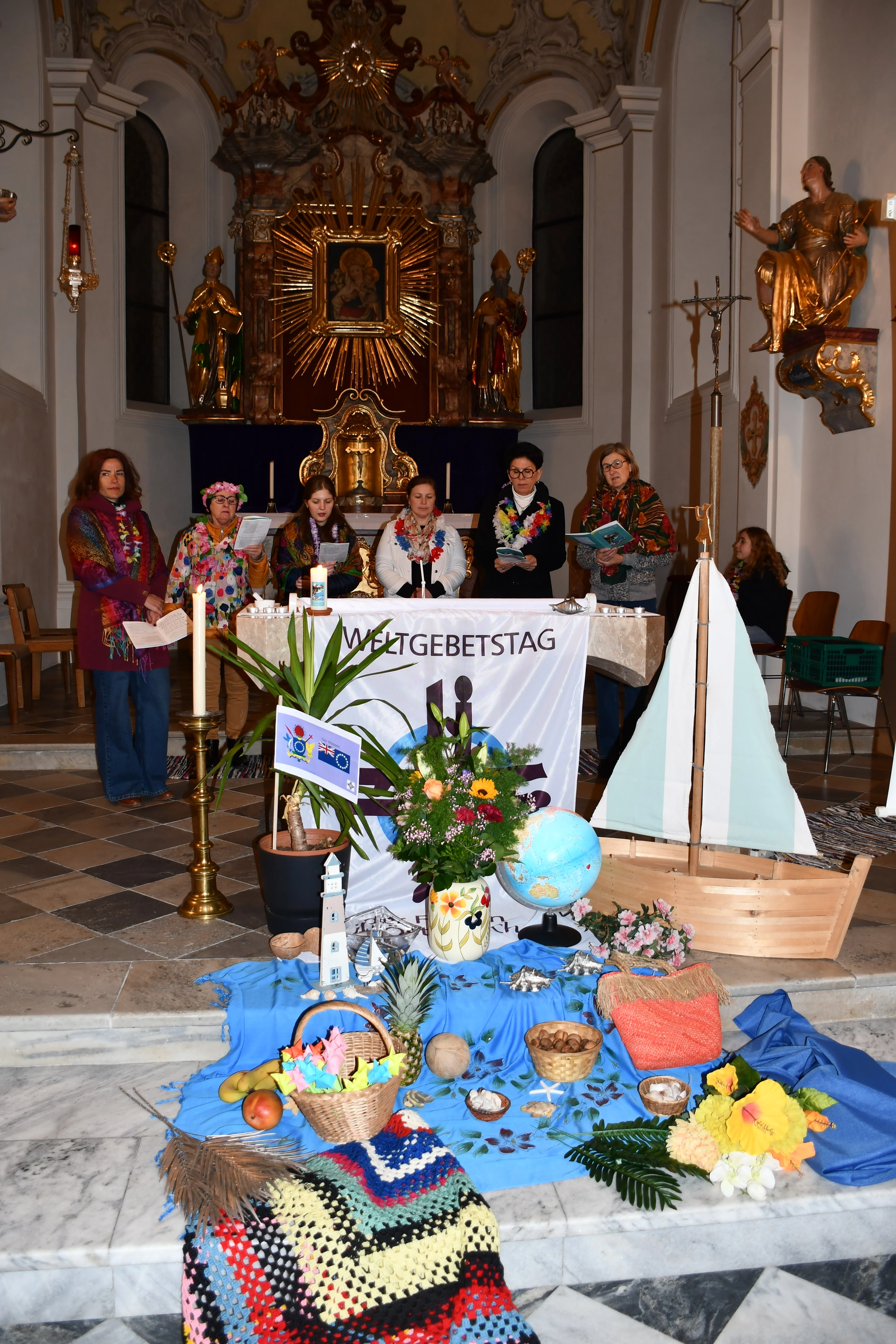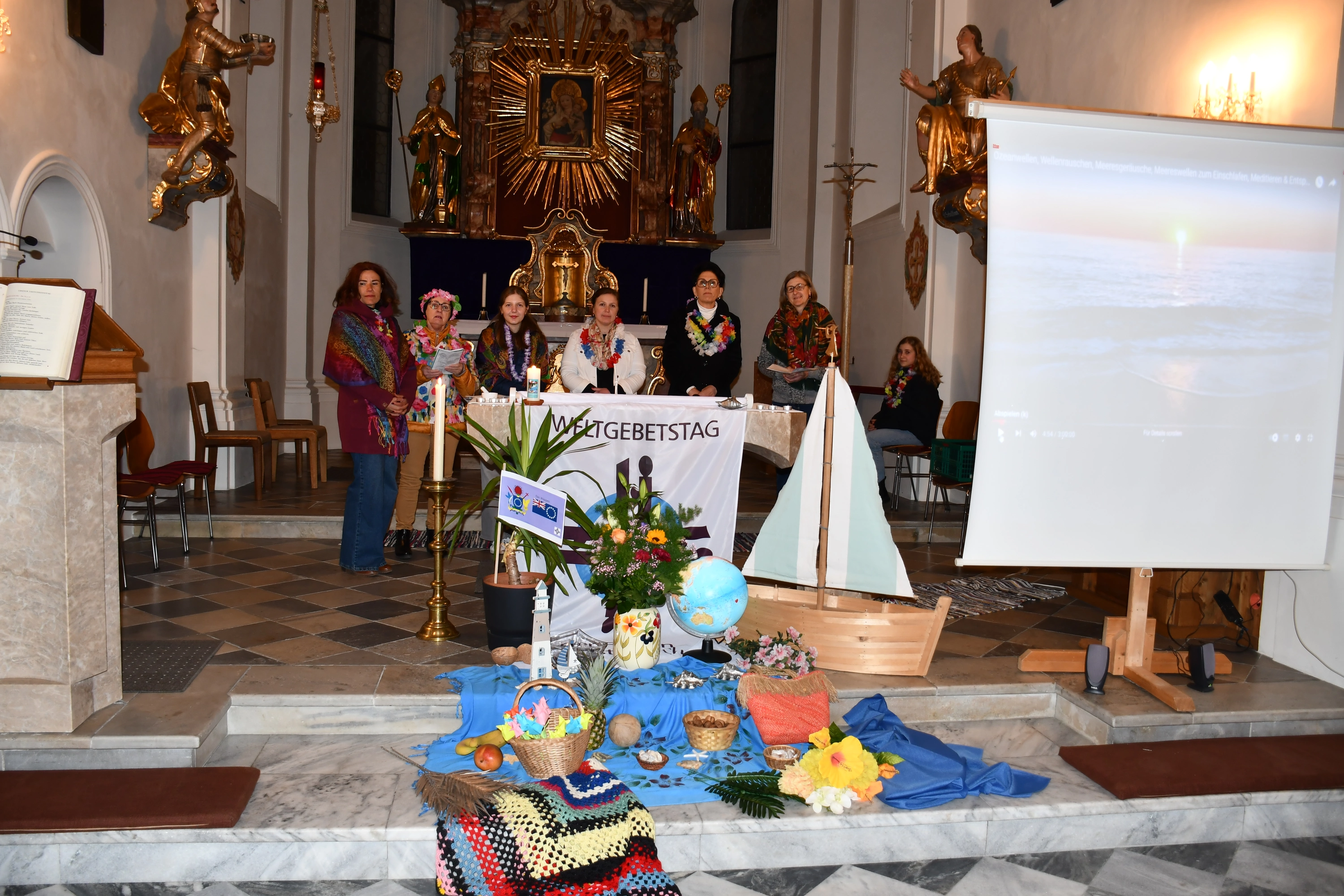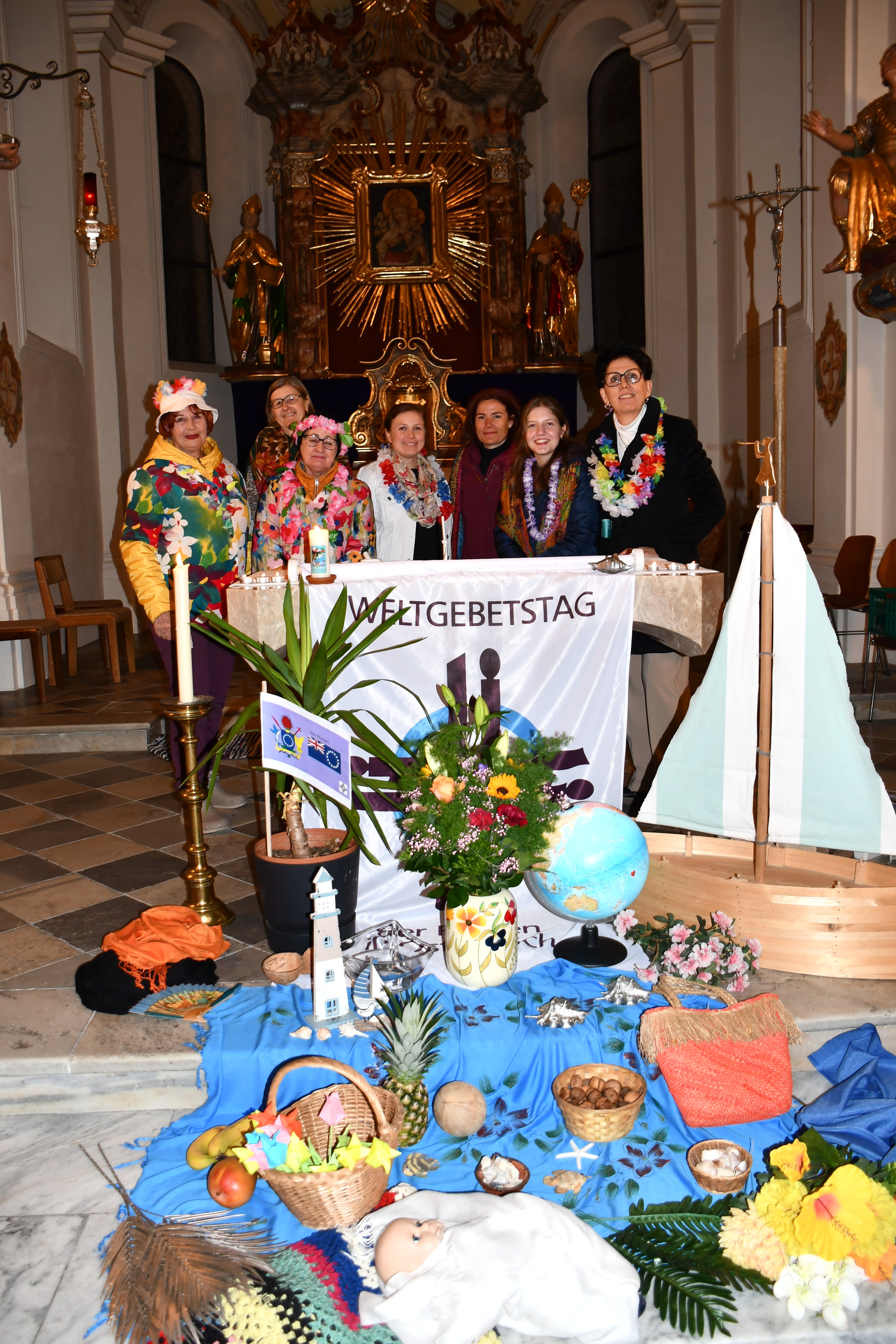 Dieser besondere Gottesdienst wurde heuer von den Frauen der Cookinseln vorbereitet. Das Motto lautete „wunderbar geschaffen“ in Anlehnung an Psalm 139, Vers 14. Ja, wunderbar geschaffen sind die 15 im Südpazifik gelegenen Inseln, die nach dem britischen Seefahrer James Cook benannt worden sind. In der Liturgie hörten wir drei Lebensgeschichten von den christlichen Schwestern. Alle drei Frauen richten ihre Ängste, Sorgen immer wieder an Gott und erleben, dass Gott ihnen hilft. In einem Videofilm sahen und hörten wir viel Interessantes und Schönes über die Inseln. Vor dem Altar konnten die BesucherInnen eine wundervolle Dekoration bewundern mit Blumen, Früchten und weiteren Gegenständen, die alle in Bezug mit den Inseln stehen. Die Kokospalme ist z. B. für die Bewohner der Cookinseln der Baum des Lebens. Das Boot symbolisiert die Ankunft des Christentums vor 200 Jahren. An dieser Stelle möchte ich meinem Team herzlich danken für die hervorragende Mitgestaltung, sowie dem Kirchenchor Stumm für die musikalische Unterstützung und Gerhard für die Filmvorführung. Den feierlichen Abend beendeten wir mit einer feinen, kleinen Agape.